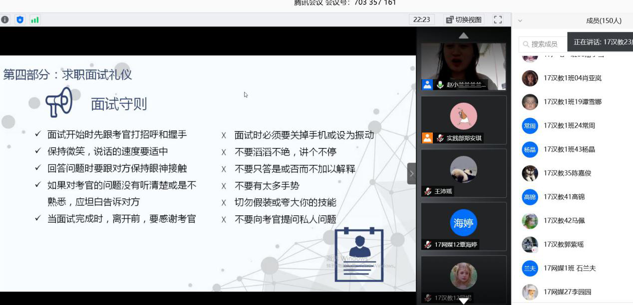 赵雅兰老师重点讲解了面试礼仪、常见的面试形式和面试题目以及签约的相关注意事项,并就面试相关的物品准备、着装打扮和可能遇到的敏感问题等进行针对性地讲解。