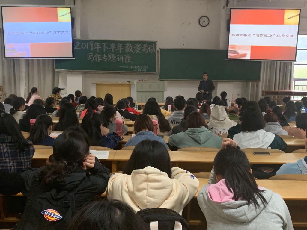 (记者 王润佳)10月25日下午,我院在玉衡楼南栋201教室举办了“2019年下半年师范生国家教师资格证写作”专题讲座。讲座由院长龙永干主讲,学工办主任唐科主持,我院2017级师范生共计500余人参加了本次讲座。