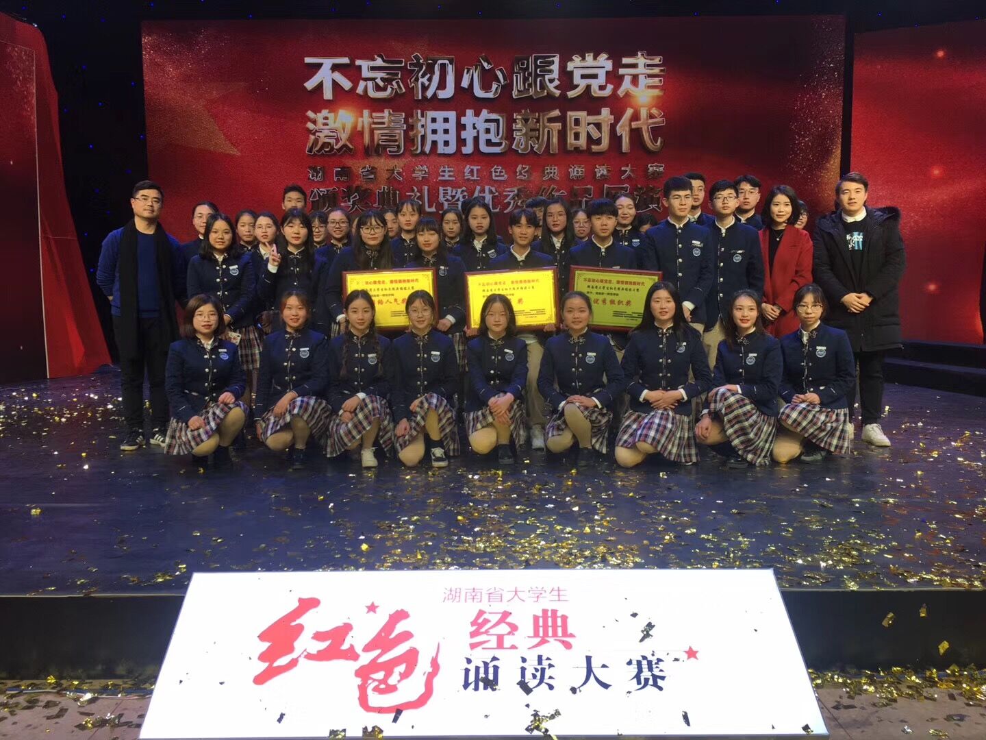 12月21日,湖南省大学生红色经典诵读大赛颁奖典礼暨优秀作品展演在湖南教育电视台录播。我校推选的诵读节目《百年初心忆伟人》荣获二等奖第一名,本节目由我院教师张忺寒、安炜成指导,由我院104名学生合作完成。同时,我校还获得“网络人气奖”和“优秀组织奖”。