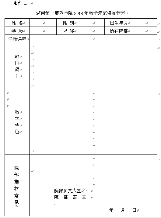 附件1:湖南第一师范学院2018年教学示范课推荐表