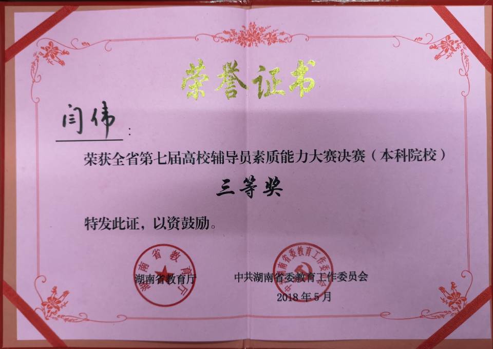 近日,在湖南省第七届高校辅导员素质能力大赛(本科院校)中,我院辅导员闫伟老师喜获三等奖。