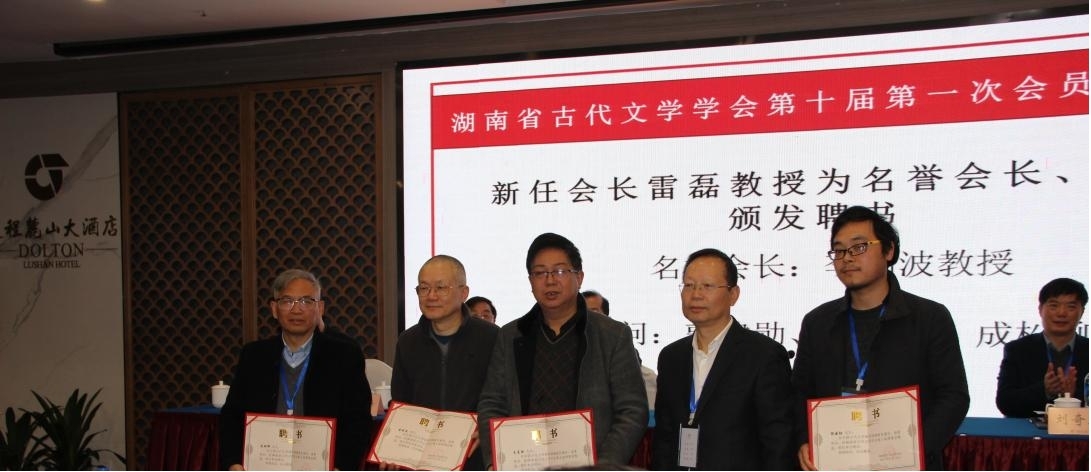 当天上午,大会还审议表决了第九届会长李剑波教授所作的第九届理事会工作报告,审议表决了《湖南省古代文学学会章程修改稿(草案)》,并举行了换届选举。大会选举产生了第十届理事会,来自湘潭大学的雷磊教授全票当选第十届理事会会长。湖南师范大学吕双伟教授、吉首大学罗惠缙教授、湖南科技大学刘奇玉教授、湖南大学牛海蓉教授、长沙理工大学郑劭荣教授当选为副会长。湘潭大学符继成教授为秘书长及法定代表人。省内各高校长期致力于古代文学研究的学者16人当选为常务理事,53名学者当选为学会理事。湘潭大学谷文彬副教授当选湖南省古代文学学会党支部书记。大会还推选李剑波教授担任学会名誉会长,湖南大学郭建勋教授、湖南科技大学王友胜教授、长沙理工大学成松柳教授担任学会顾问,并现场颁发聘书。