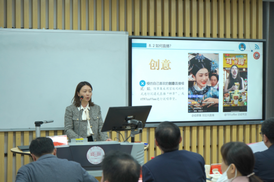 会上,方菲与刘汾两位老师分别从不同角度,分享了金课建设与课程改革经验。方菲以“新媒体数据分析与应用之直播‘种草’”为主题,围绕产品运营、内容运营、直播账号运营等方面对开源·浏阳河集团产品的直播进行分析研究,为教师产教融合与协同创新起到了良好的示范作用。刘汾带大家领略了“豪放词的要眇宜修之美”,分析体会辛弃疾词作《摸鱼儿》中呈现的“肝肠似火”“色貌如花”的双重意蕴,提出古代文学教学要做到“知人论世”,与教学内容“贴而不隔”,从而跨越历史的“长度”追求课堂的“深度”。