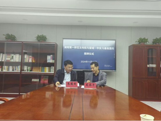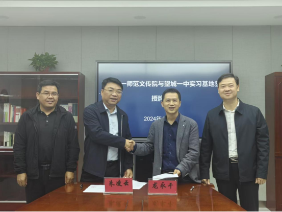 2024年11月15日,在长沙市望城区第一中学举行了实践教学基地建设签约仪式。长沙市望城区第一中学党委书记朱凌云、课程教务中心主任李文华、高一年级部主任刘凯奇以及我院党委书记刘立勇、院长龙永干、教科办主任林璟辉参加了签约授牌仪式。