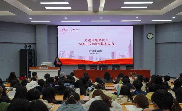 大会议程第二项,先进班集体代表22级润之英才班班长周琪淇、23中文2班班长谢杭彤介绍班级建设经验。周琪淇同学从“学业成绩、学科竞赛、志愿活动、公寓建设”四个方面,分享本班学风建设经验,鼓励同学们“学思并进、知行合一”。