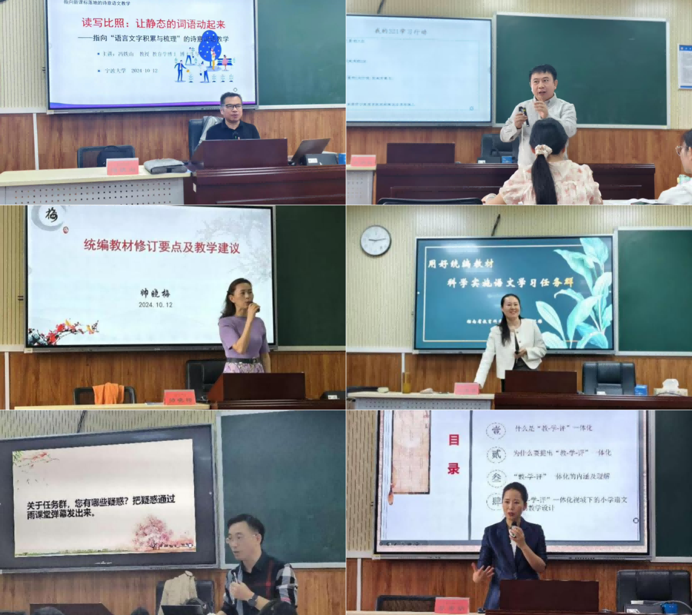 宁波大学博士生导师冯铁山、乐山市教育科学研究所许泽能、广东教育杂志社龙建刚、湖南省教育科学研究院小学语文教研员刘亚雄、衡阳师范学院副教授邓水平、湖南师范大学周敏、株洲市教育科学研究院副院长帅晓梅、湘潭教育学院教授宋见林、一师星沙实验小学党支部书记李素娟分别主讲《读写比照:让静态的词语动起来——指向语言文字积累与梳理的诗意词语教学》《让课堂充满思考力》《教育教学论文写作的思路与出路》《用好统编教材,科学实施语文学习任务群》《例说语文学习任务群》《语文大单元教学的思与行》《统编教材修订要点及教学建议》《人工智能赋能教育教学》以及《“教-学-评”一体化背景下的小学语文课堂教学》,他们分别从培训政策与法规、培训与管理理论、培训与管理实务等不同维度,通过任务驱动、案例学习、问题研讨等多元方式引导学员深思。