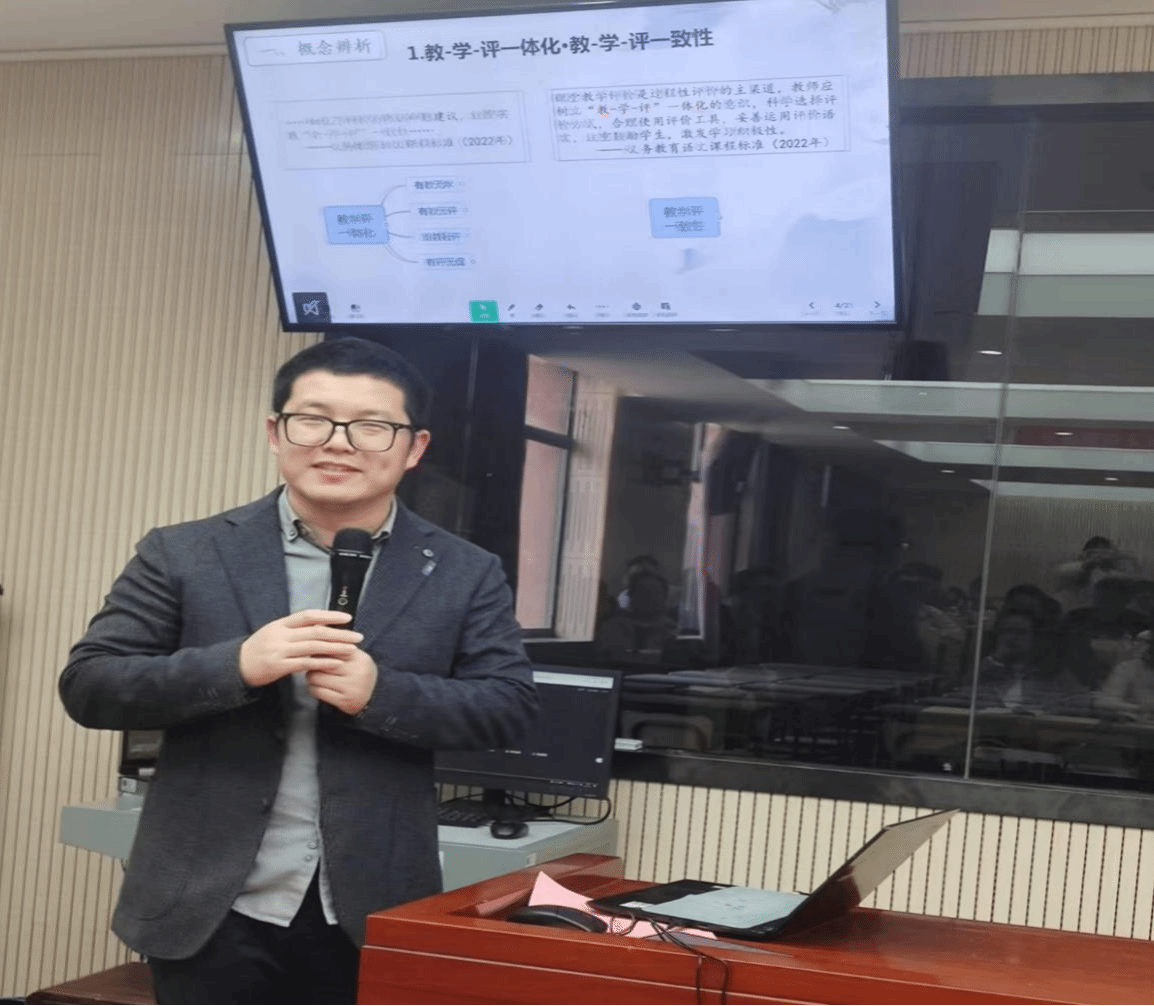 评课环节中,周杨林老师结合陈晓星老师的课堂教学效果,围绕“教学评一体化”主题,对陈老师设计的思、辩、创三个学习任务活动,以及由此衍生的三个评价量表进行了具体分析,并对课堂呈现的精彩内容给予了充分肯定。周杨林老师希望新疆学员在夯实学科理论素养的基础上,以示范课作标杆,进一步提升课堂教学水平。康江昆组长紧扣这堂示范课及老师们的评课意见,作了《教学评三环紧扣的语文单元设计实践与思考》的专题讲座,解答了学员对课程改革的相关疑惑。