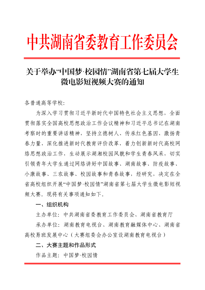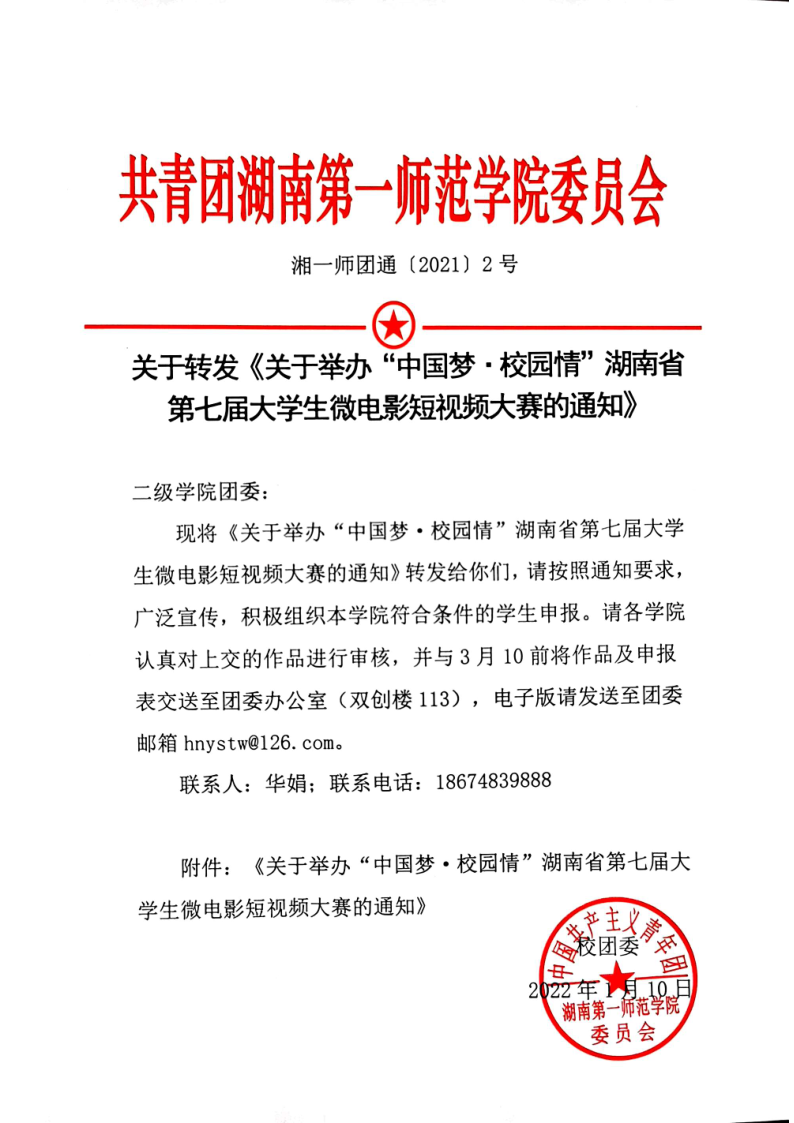 关于转发《关于举办“中国梦.校园情”湖南省第七届大学生微电影短视频大赛的通知》的通知