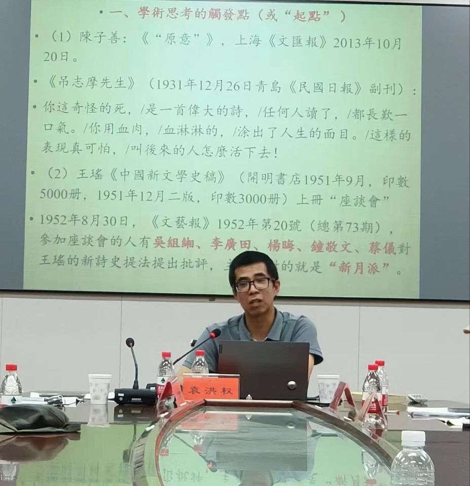 6月11日下午,贵州师范大学文学院博士生导师袁洪权应邀为我院师生开展题为“《中国新诗选1919-1949》编选、出版的前前后后”的学术讲座。讲座由院长龙永干教授主持,副院长杨水远、周军,汉语言文学系刘智跃教授、卢阿涛博士以及汉语言文学22级卓越班,22级汉语言文学2、3班全体同学100余人参与讲座。