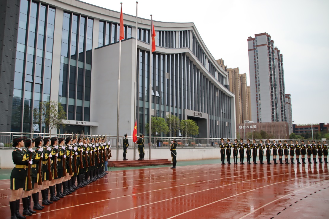 清晨七时整,伴随着指挥员的口令,英姿飒爽的国旗护卫队精神振奋、步伐铿锵地拥簇着五星红旗走上国旗台。在激昂雄壮的《义勇军进行曲》中,鲜艳的五星红旗冉冉升起、迎风飘扬,全体师生目光坚定面向国旗肃立致礼、齐唱国歌。
